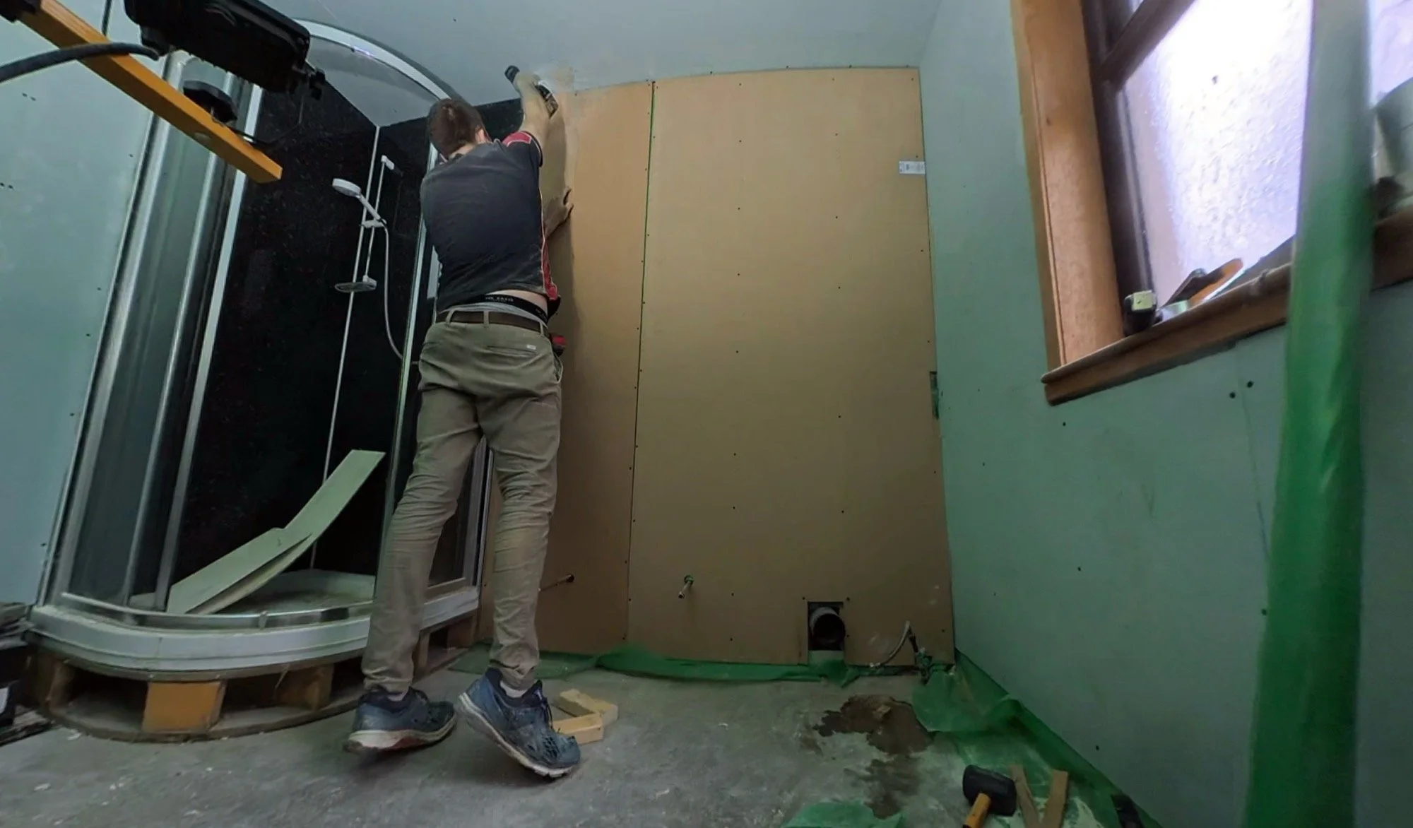 Of course, it has since been insulated, boarded and plastered, but it still hadn’t been painted. Two mist coats and two top coats later, all completed by Dan’s mum, the room is now ready to have things stuck back where they were, including the new radiator/towel rail. Because this new radiator is a tall one, Dan opted to ply and then plasterboard that one wall. You can follow the progress for that in Week 2 above, but for now, we can just look at her as of right now, complete with shower tray storage: