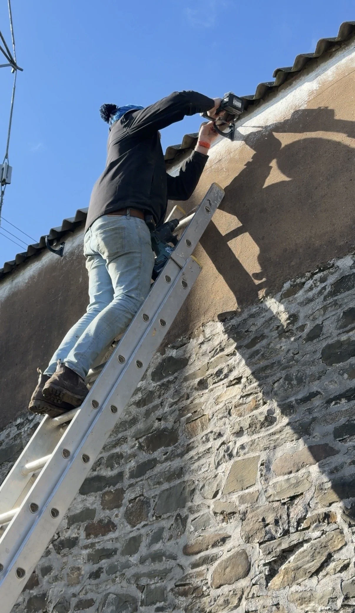 We started with fungicide treatment one, followed a brush down then treatment number two went on. In between, we pulled off the flappy dead door on the outside of the building, which sat adjacent to the Tin Can (can you remember that shed?). Next up, Dan and his dad tackled removing and replacing the guttering. It is this gutter specifically that caused a huge amount of damage to the back wall, allowing water ingress right through and a tree to grow uninhibited (see image 5 below). This wall will be repointed to make it fully watertight when the last of the frosts go (it snowed this week, we’re not there yet).
