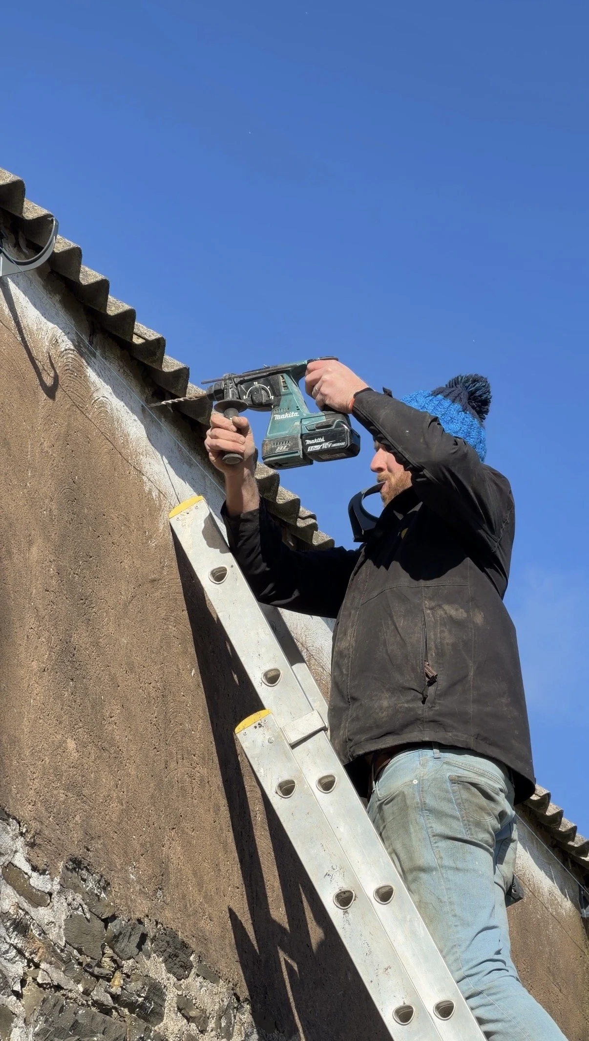 Circling back to this specific door opening, the old door is 110mm taller than the door we have to hand, but otherwise the same dimensions. This elevation gets absolutely battered by the weather but the top of the door opening isn’t shaped particularly well to allow for a shorter door to remain fully protected without a 115mm slab of white PVC and some very irregular mastic to try and protect it all with hopes and prayers. Advice we’ve received from pros who know the property was to not attempt to fill a gap above the door; instead, we should lift the door and fill/mortar over that instead for now. So that’s what we did.
