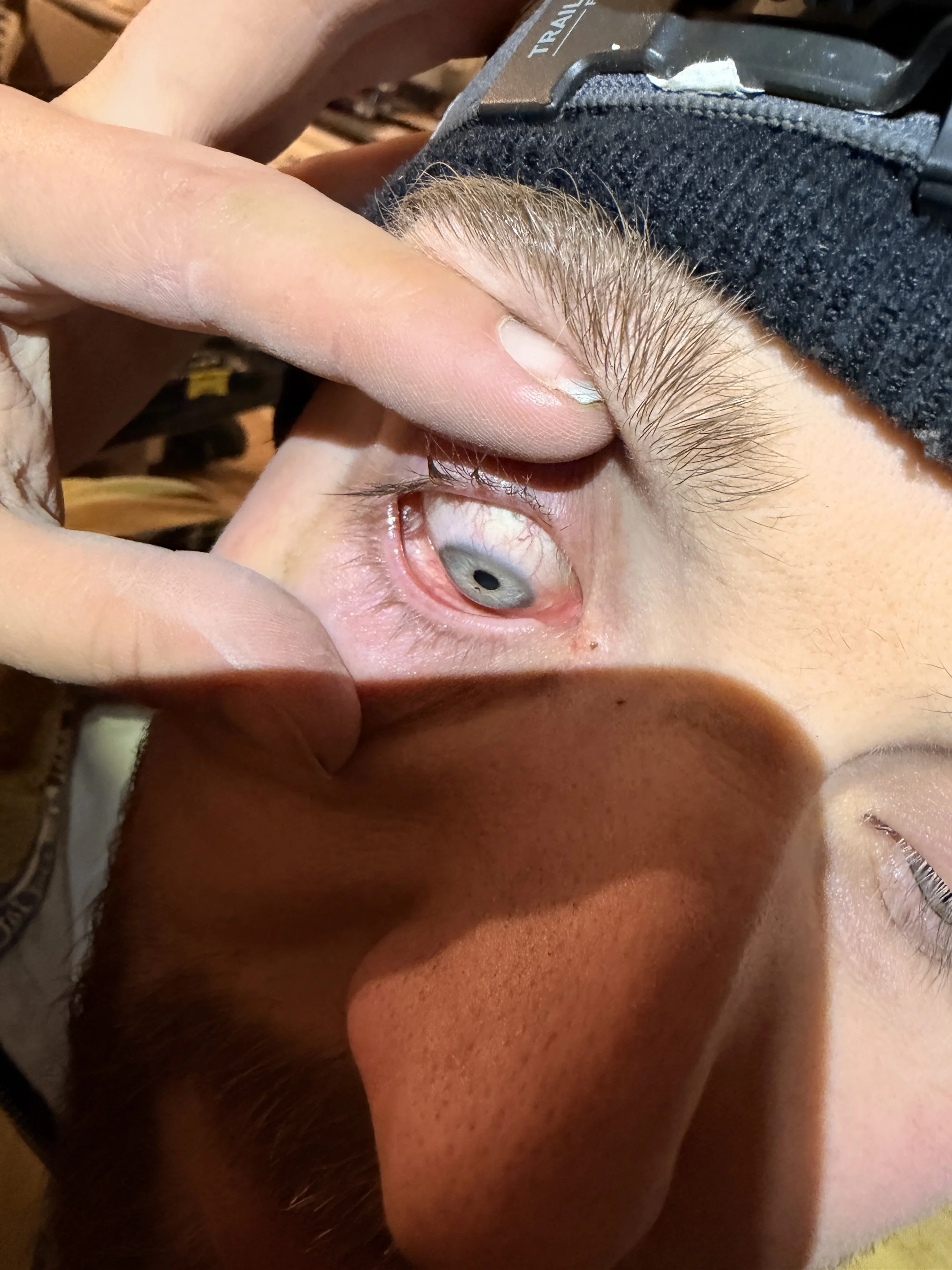 He was then cutting wood with the circular saw, dust blowing all over the shop, and a bit of dust went into his eye. We finished the door fitting, fed the dogs, brought the horses in, and it still wasn’t right. On examination, and after copious saline washes, he still had something dark and tiny stuck over his pupil, and it wouldn’t budge. The eye looked bad - it was 6:30pm on a Thursday night so A&E was the only option left.