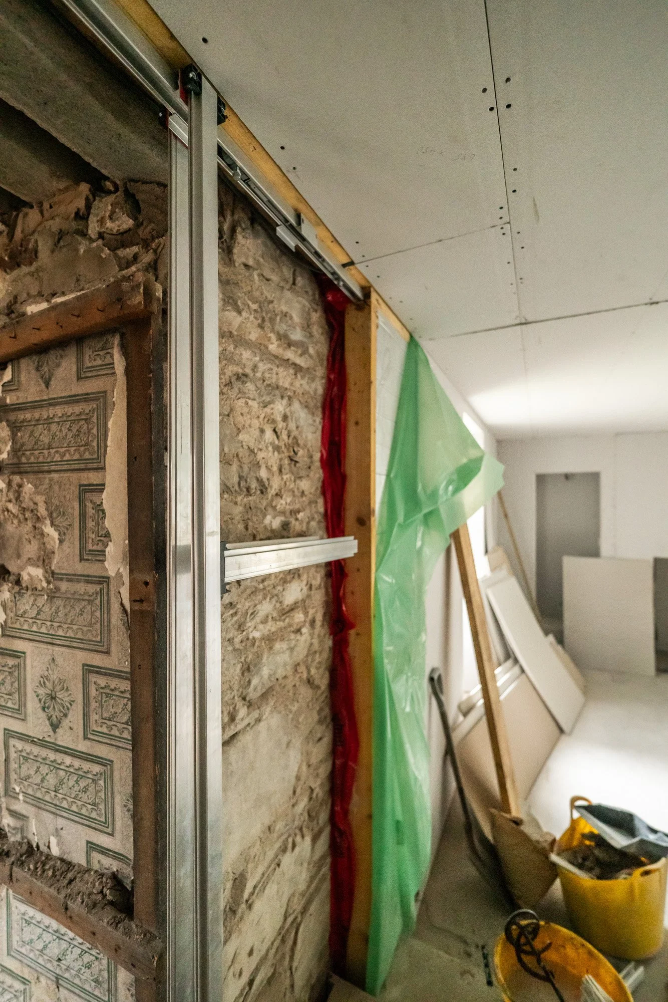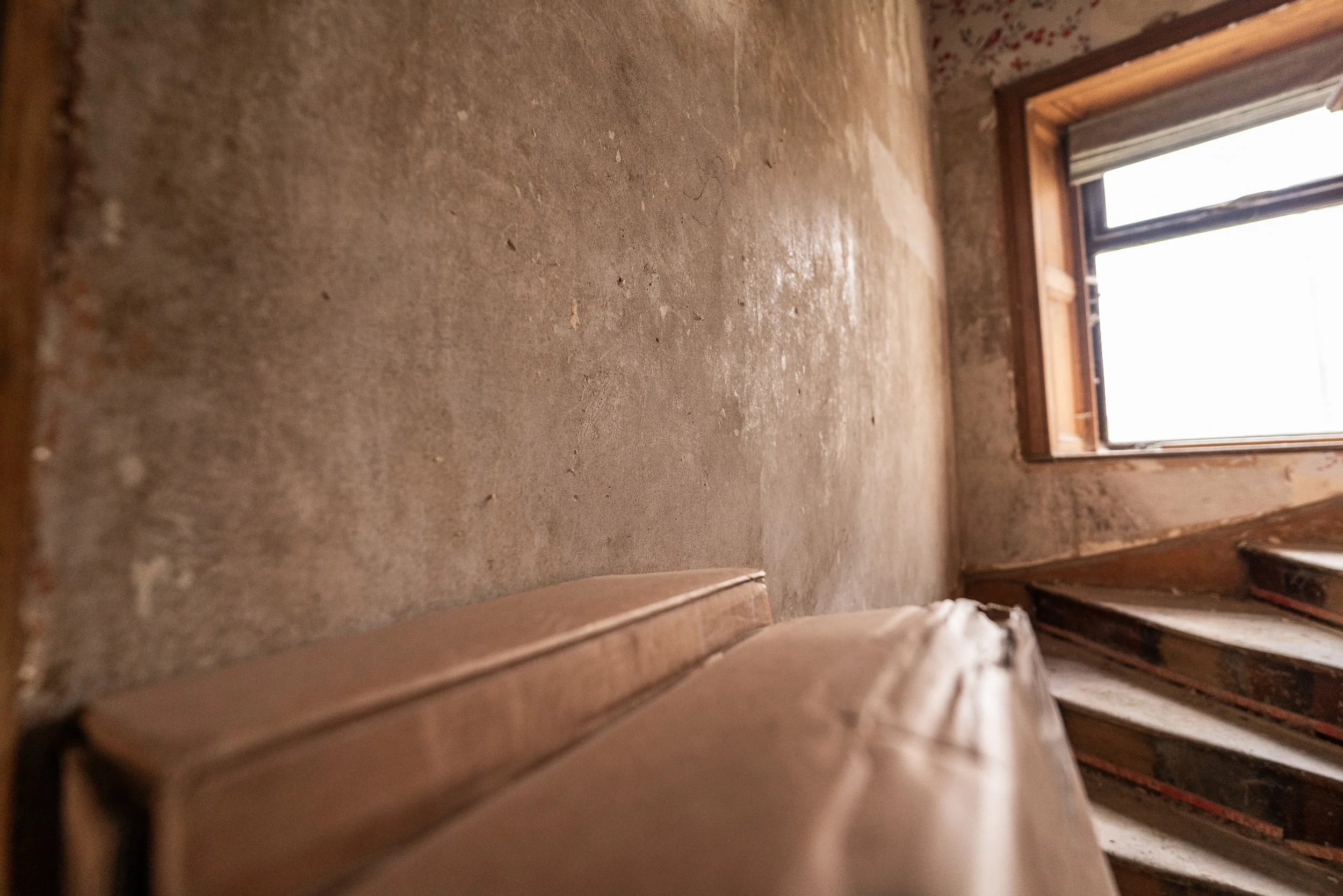 To narrow down the source to the wall and not the roof, Dan did some more demo to see if the internal wall upstairs was damp, wet, or otherwise compromised. There was a “tide line” on the wall, but we weren’t 100% sure if it was old or new. We can confirm that the tide line and mould was old (see the red paper near the peel line), the lath and stone were bone dry.