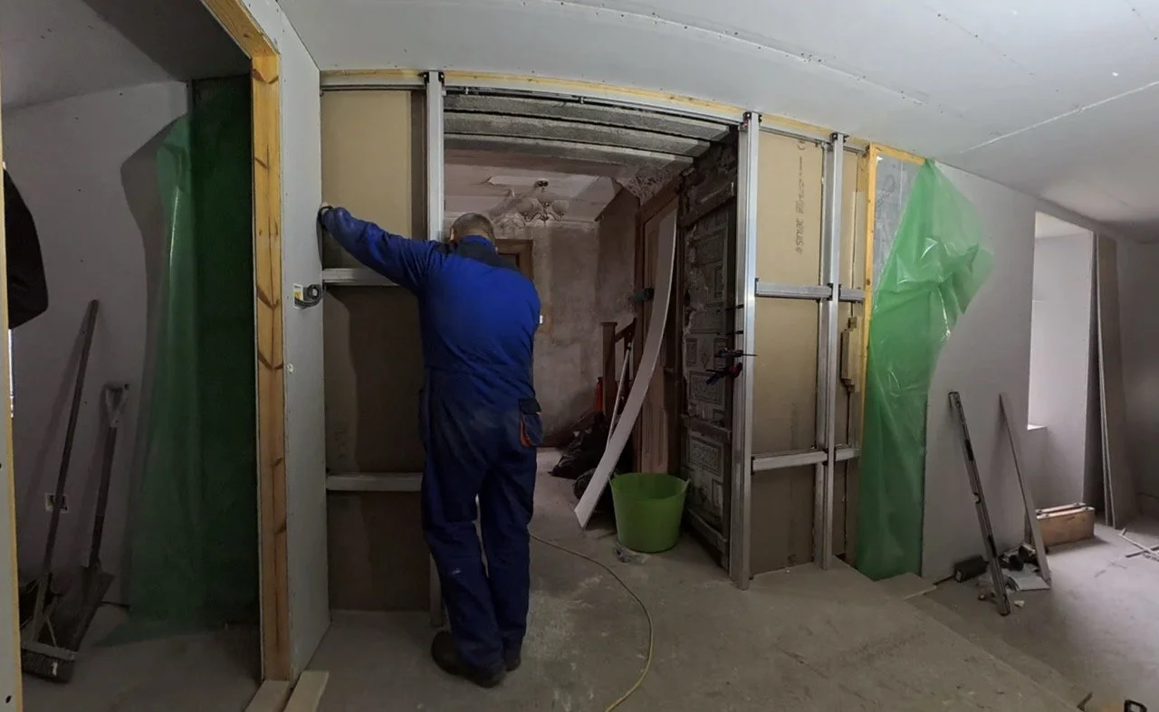 Next up was the plastering, which did indeed begin! I have so much footage and stills from this, but the lads only did a half day to get the project started, so at the time of writing (Friday, again!), this is what is currently plastered, it was done last Sunday, so it’s nearly had a week of drying out. By the end of this weekend, MUCH more will be done (spoiler alert, it wasn’t)! This is particularly exciting, because it means the end is in sight (for this section!). Another spoiler alert, it isn’t.