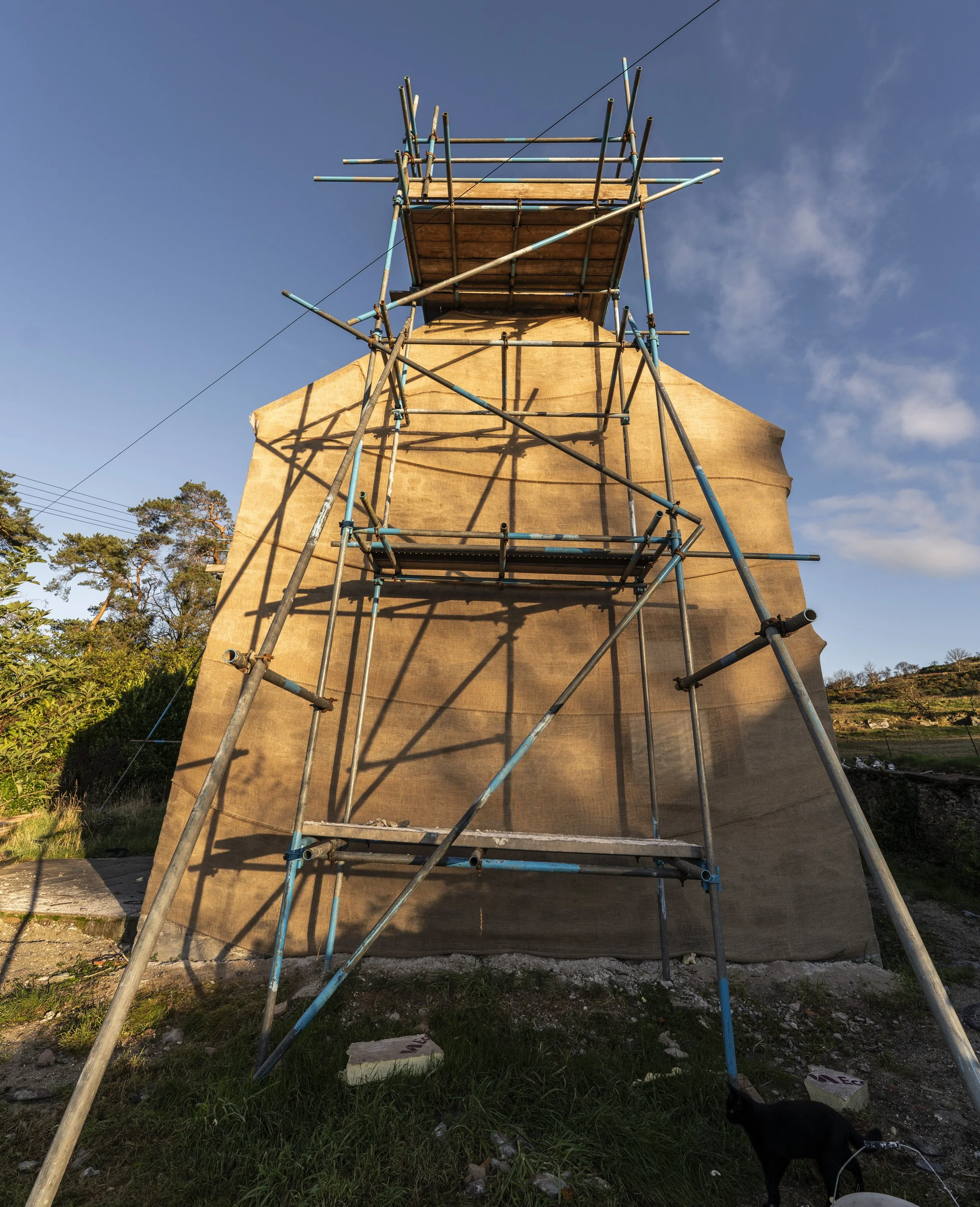 Next up was Christmas Wrapping practice, on the gable end. With the weather turning and bad weather forecast, Dan and I spent a few hours wrapping the gable in hessian strips. Hessian lets the wall breathe and dry (it specficially lets carbon dioxide get to the lime), but it protects the pointing from driving rain, drying winds and frost. All of these are imperative.